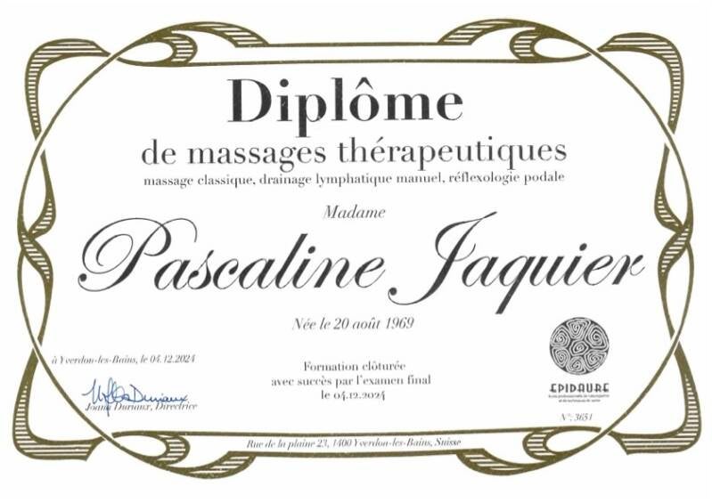 j'ai le plaisir de partager avec vous l'obtention de mon diplôme de massage thérapeutique et de mon certificat de drainage lymphatique manuel. Trois années d'étude et de pratique pendant lesquelles, j'ai découvert avec passion, la complexité du corps humain et nombreux de ses secrets .